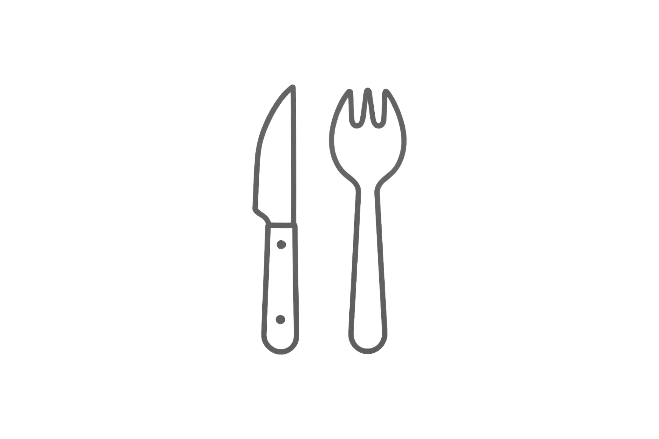Knives, forks, and related eating tools for meal preparation and dining in the field or at camp.