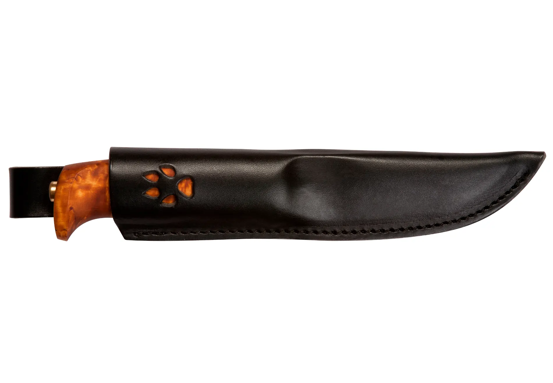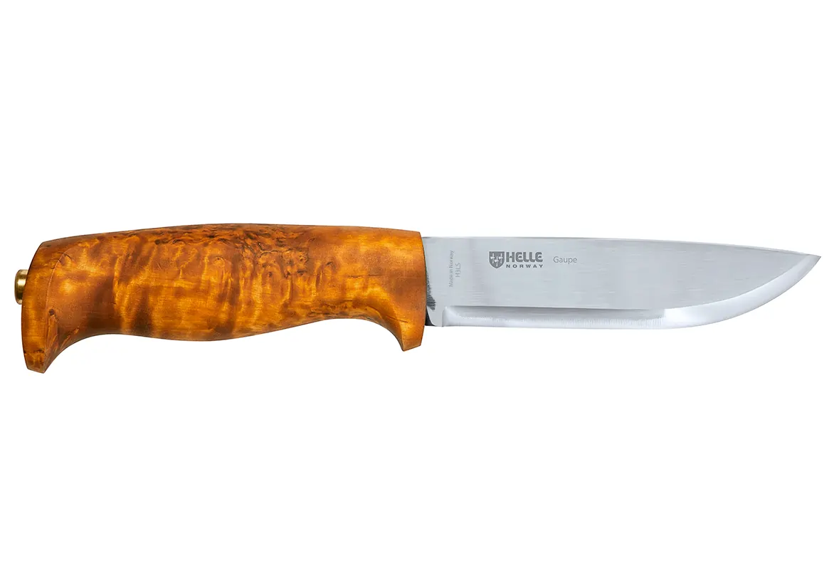 Introduced in 2011, the Gaupe ("lynx" in Norwegian) channels the character of its namesake—beautiful, nimble, and strong. It features a classically Scandinavian shape with a small finger guard for controlled, safe handling. The curly birch handle is hand-shaped and sanded to a satin finish for maximum grip security and comfort, suited to longer outdoor sessions in bushcraft, carving, or hunting. The razor-sharp triple laminated Helle stainless blade (107 mm) is fixed by a stick tang construction, offering robust reliability while staying balanced and lightweight. A genuine leather sheath adds classic protection for convenient belt carry. The Gaupe's styling and utility make it one of the most popular all-rounders in Helle’s lineup.