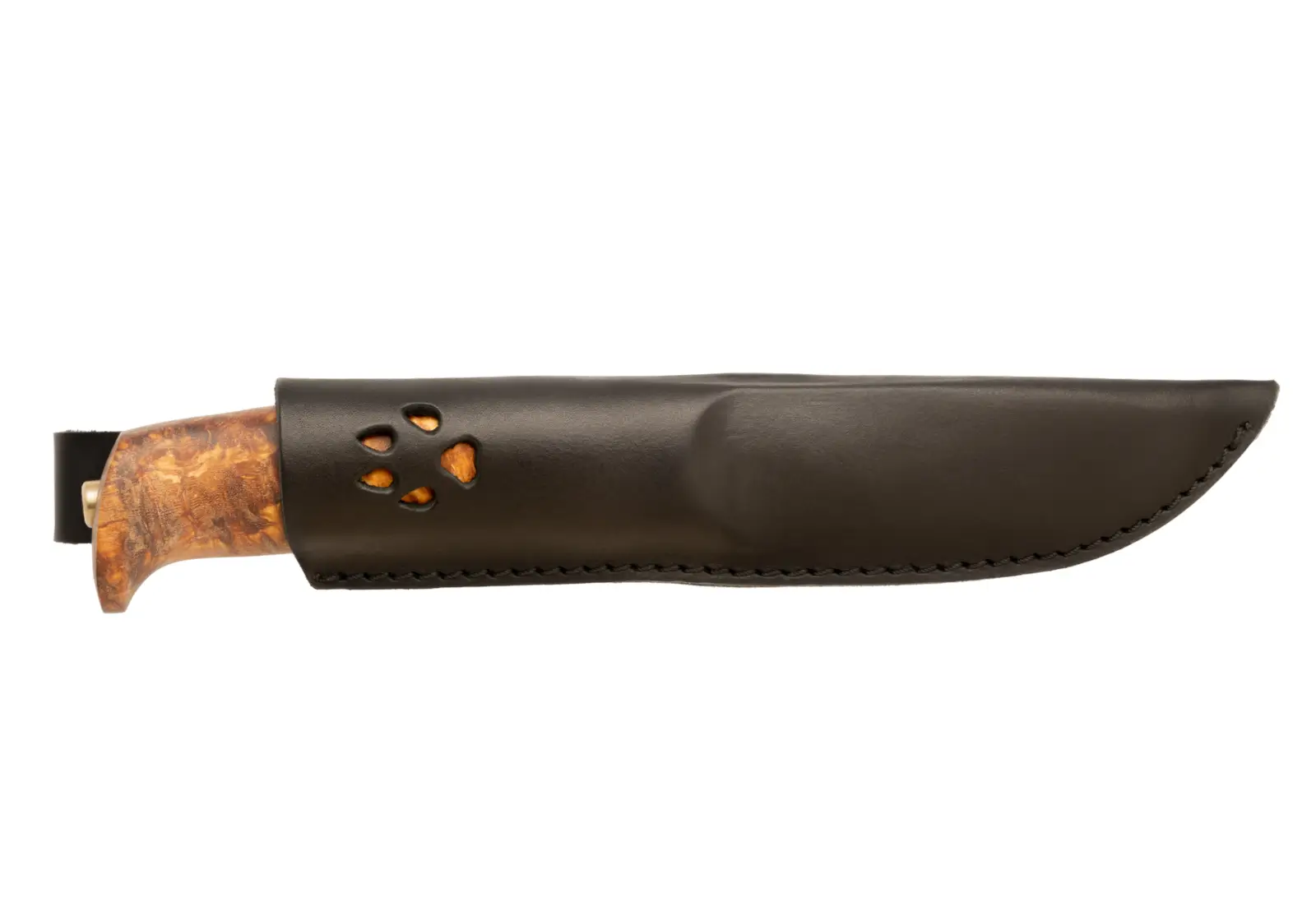 Built for adventure, the Helle Gaupe 12C27 is a mid-size outdoor knife with a Sandvik 12C27 stainless blade, curly birch handle, and leather sheath.