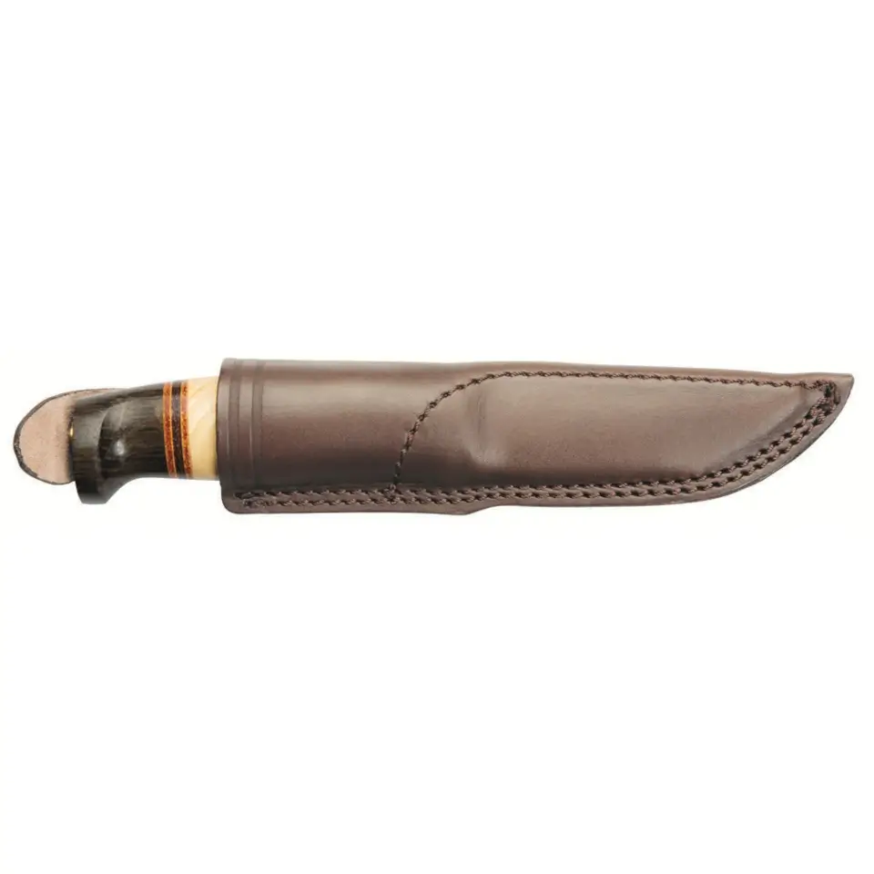 The barrel-shaped handle combines curly birch, darkened oak, and layers of leather, carefully hand-crafted, sanded, and polished for both comfort and aesthetic appeal. A traditional leather sheath completes the knife, offering secure protection and a timeless look.
