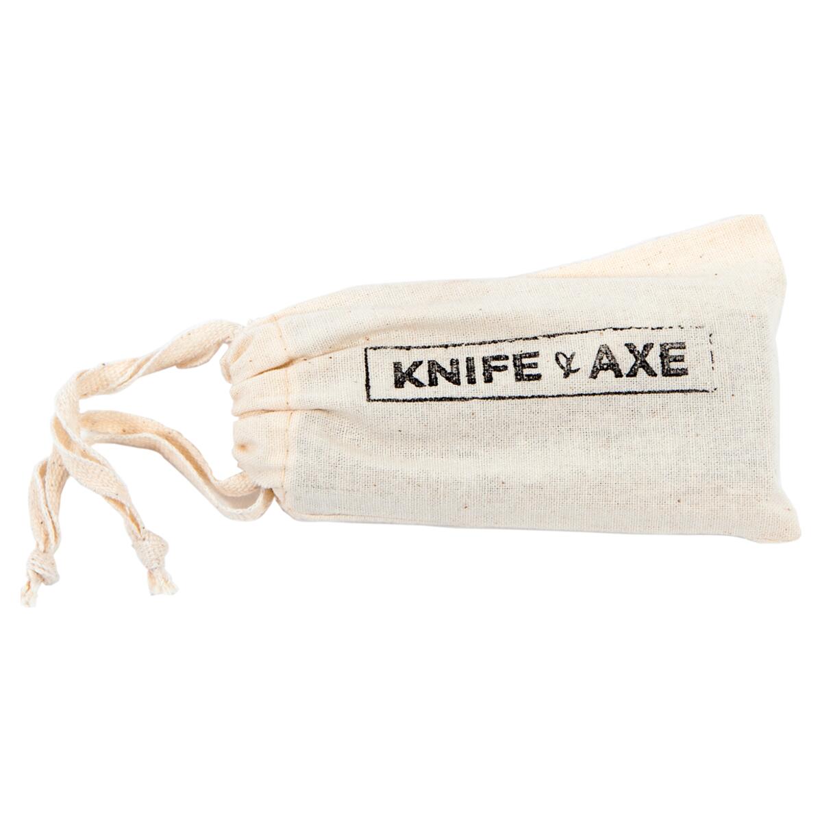 The Knife Stone by Knife & Axe is a portable, double-sided 220/400 grit ceramic sharpening stone with a 10 cm length, made in the USA and supplied with a cotton pouch.