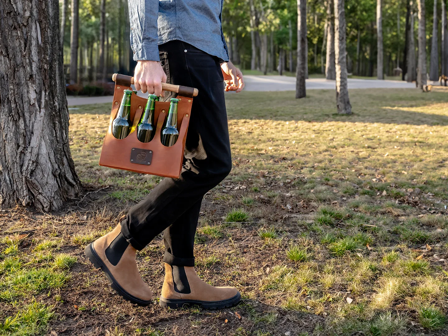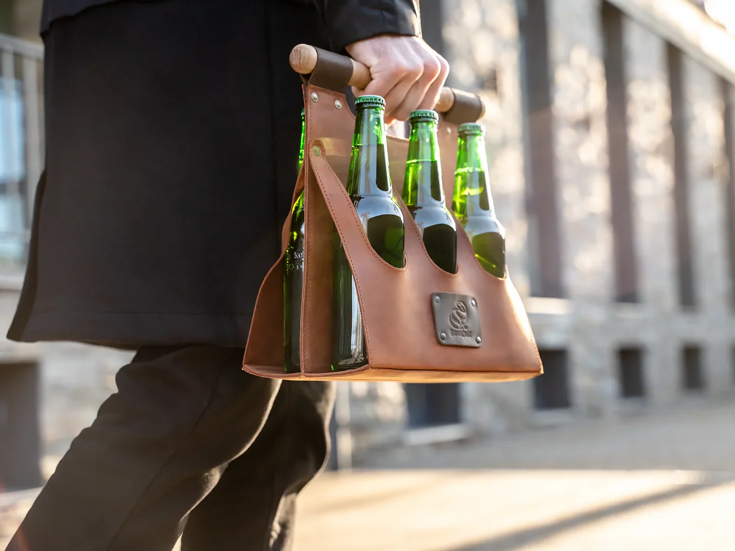 - Premium cowhide leather 6‑pack carrier in classic brown finish.