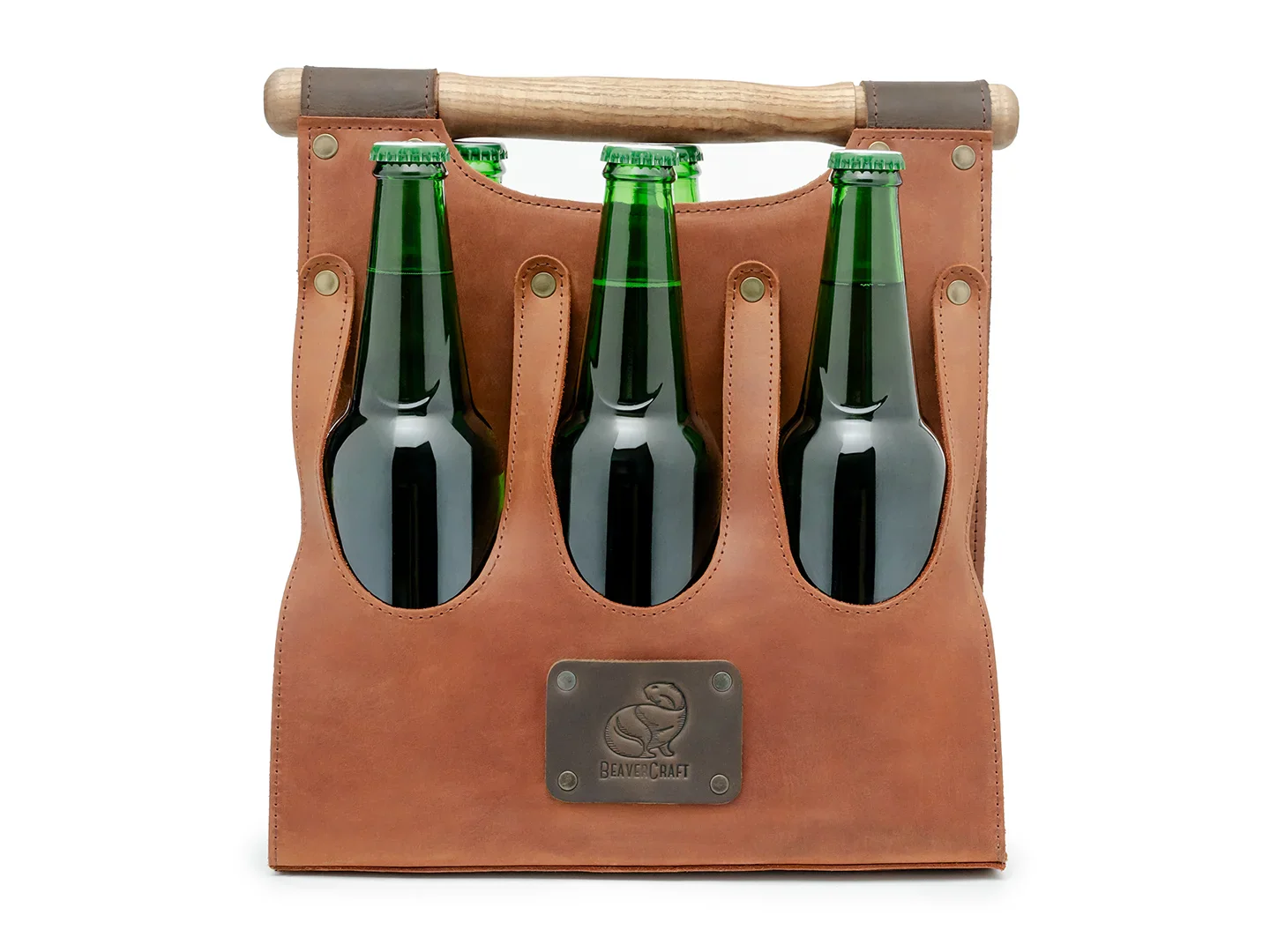 The BeaverCraft LC_BH6 Leather Beer Carrier is a premium 6‑pack bottle caddy made from classic brown cowhide leather with an ash wood handle, designed to transport beer, homebrew, wine, or soft drinks safely and in style.