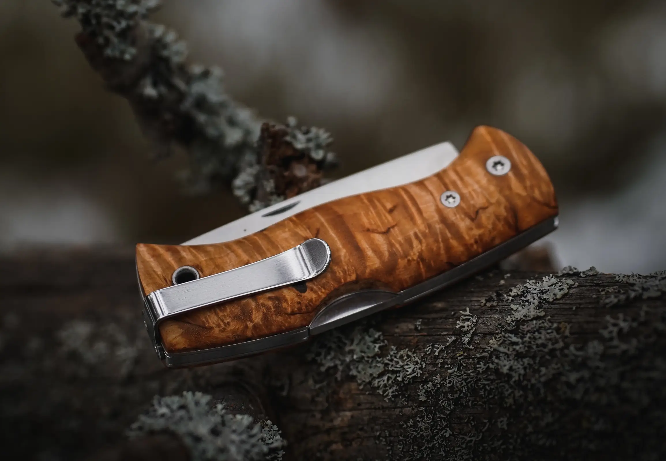 The Nipa folding knife is a compact, Scandinavian-made EDC folder that combines a stout Sandvik 12C27 stainless steel blade with a hand-sanded curly birch handle for everyday carry, bushcraft, and camp use. With a mid-size profile, four-finger grip, and detachable pocket clip, it offers a secure, comfortable feel in hand while remaining easy to carry in a pocket or pack.