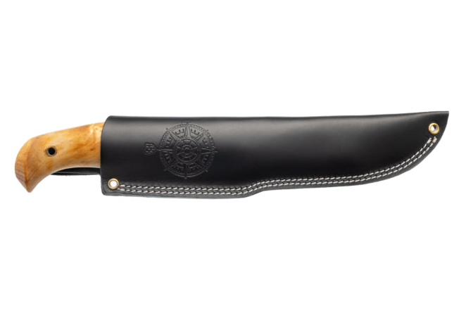 The Helle Nord Knife is a large, full-tang outdoor and bushcraft knife designed for the demands of Scandinavian wilderness. It features a 3.7 mm 14C28N stainless steel blade, curly birch handle, and a sleek black leather sheath for reliable, balanced performance in a wide range of outdoor tasks.