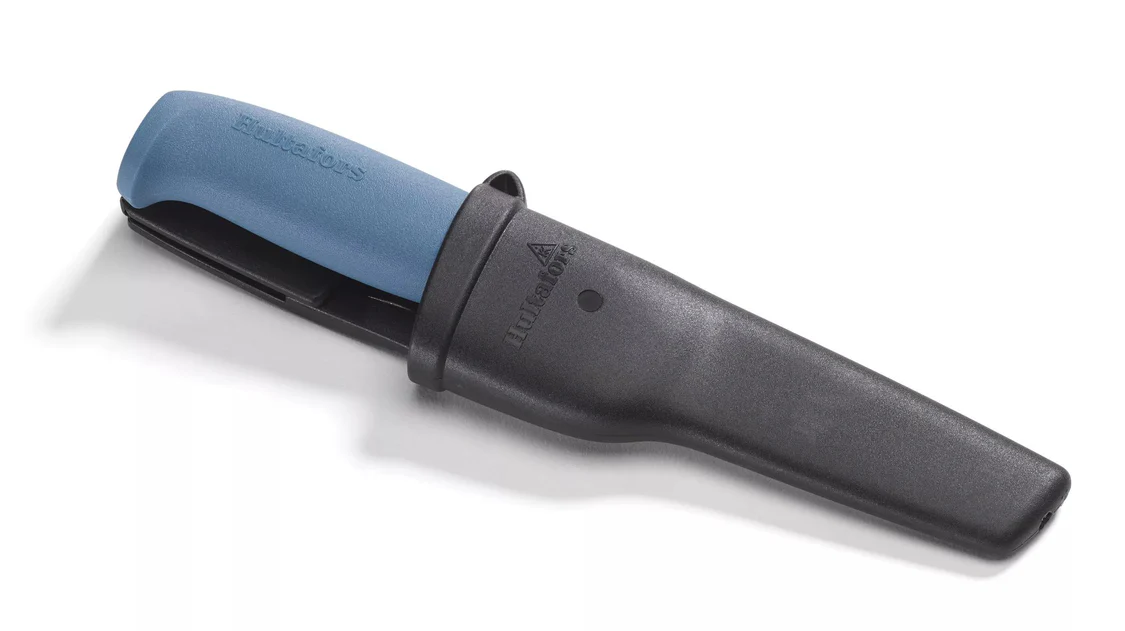 A knife designed with a dull point, developed and adapted to minimise sticking injuries. It features a unique function for attaching the holster around a button on your work clothes so that it does not come loose whilst still being easy to remove. The blade is made from German knife steel, 2.5 mm stainless steel that has been hardened to 57–59 HRC.