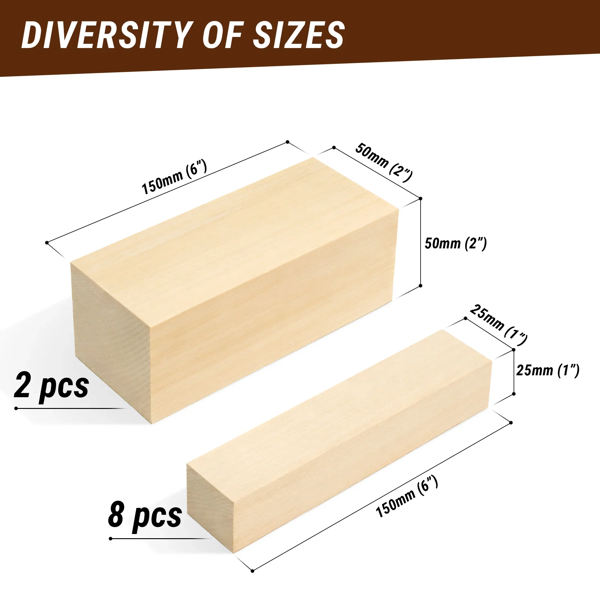 - Set of 10 basswood blocks: 2 pieces at 2" x 2" x 6", 8 pieces at 1" x 1" x 6".