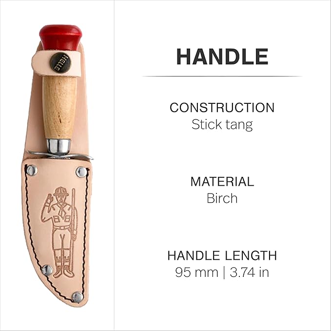 Crafted for young adventurers, the Speiderkniv Gutt features a razor-sharp Sandvik 12C27 stainless steel blade and an ergonomic birch handle sized for smaller hands. Safety is paramount, with a double finger guard preventing slips during learning. Its durable leather sheath, embossed with a Boy Motif, provides secure carry and an authentic Norwegian touch. Trusted as the first knife by generations of scouts, it’s ideal for teaching knife safety, responsibility, and enjoyment in nature.