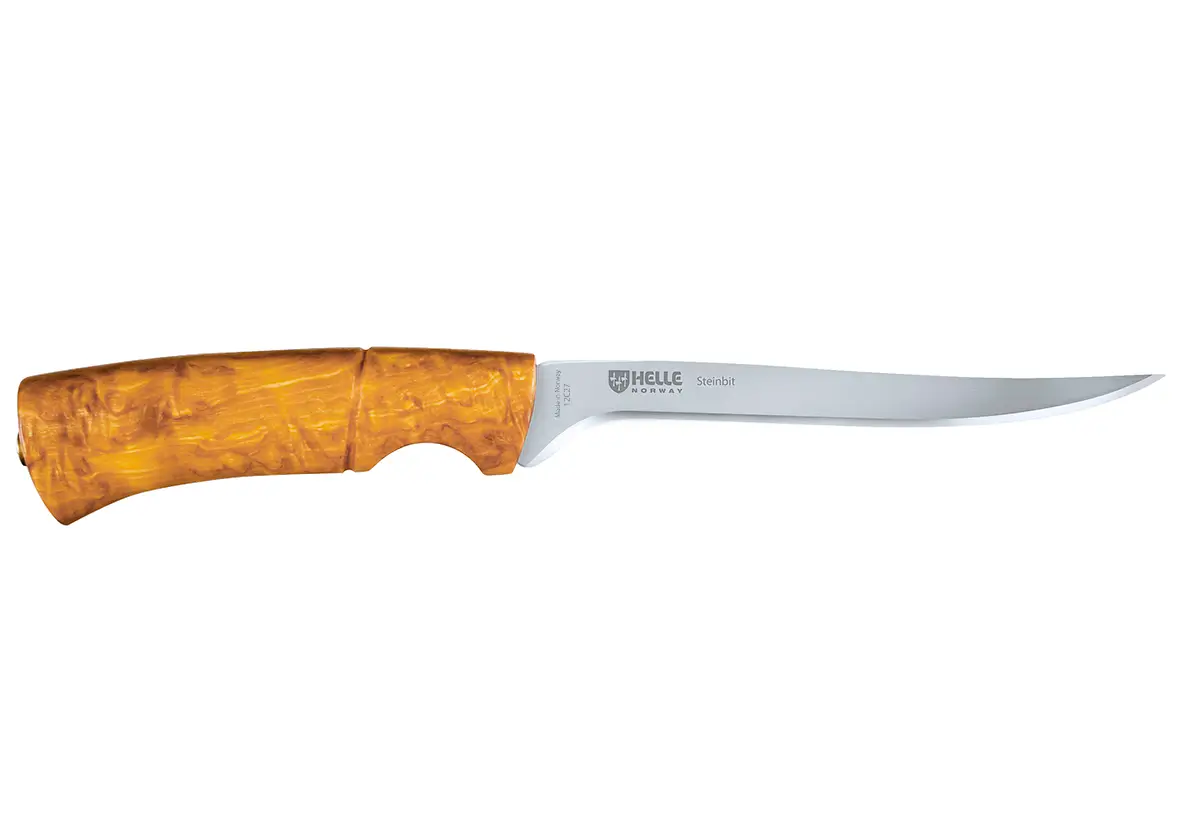 The Helle Steinbit is a beautifully crafted, flexible fillet knife prized by anglers for over 30 years. Featuring a razor-sharp stainless steel blade and elegant curly birch handle, it’s the perfect companion for any fishing adventure—freshwater or saltwater.