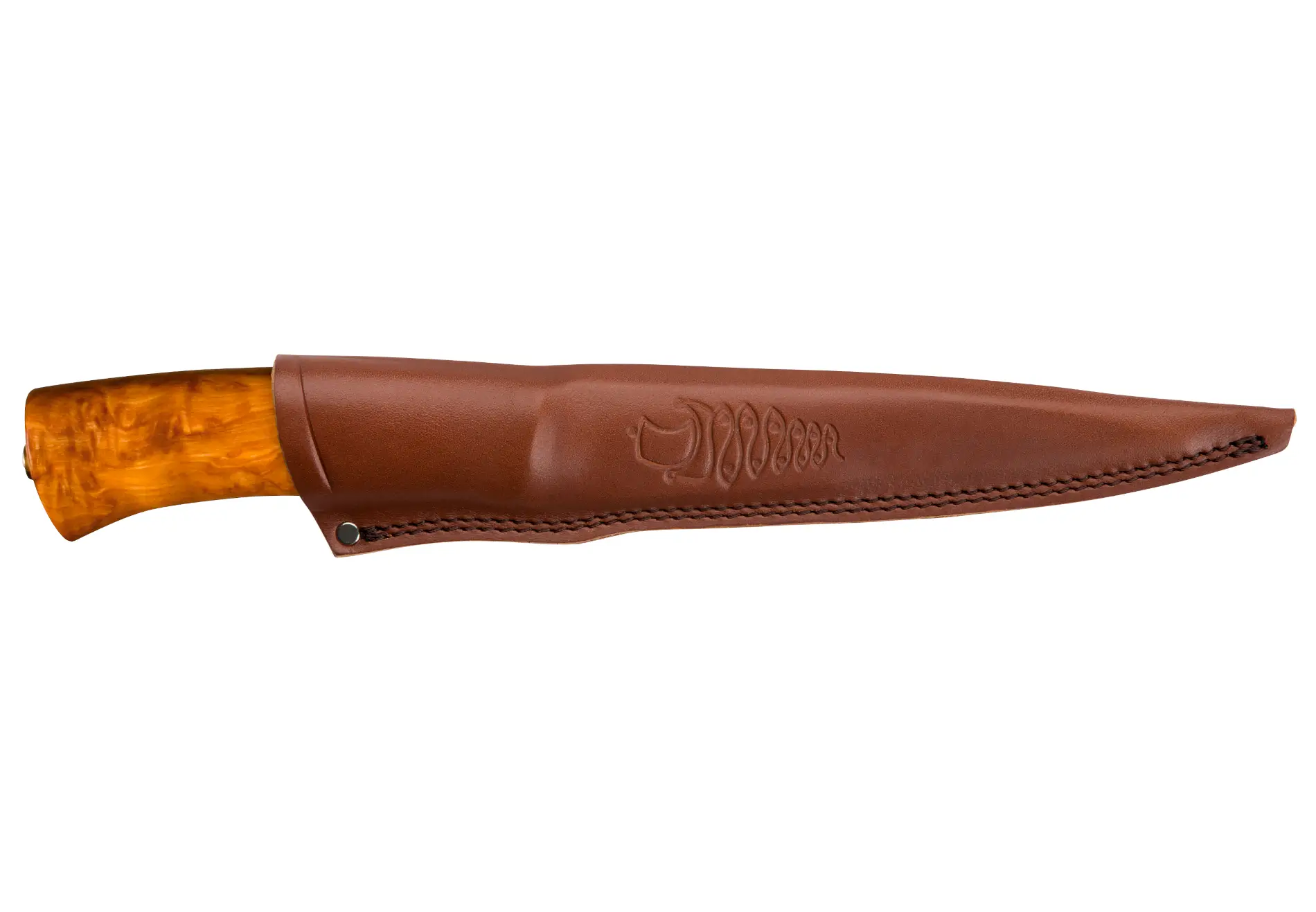 Designed by Espen Thorup in 1990, the Helle Steinbit was inspired by Norway's deep fishing traditions and tailored to meet the needs of demanding coastal and inland anglers. Its long, slim blade is hand-polished and expertly sharpened for clean, precise filleting of even the largest fish. The curly birch handle is sanded to a satin finish, revealing the unique patterns in the wood and ensuring a comfortable, controlled grip even in wet conditions. Complete with a genuine leather sheath for safe carry, the Steinbit blends Scandinavian beauty with practical performance—a special gift for any fisherman or woman who appreciates craftsmanship and a reliable tool.