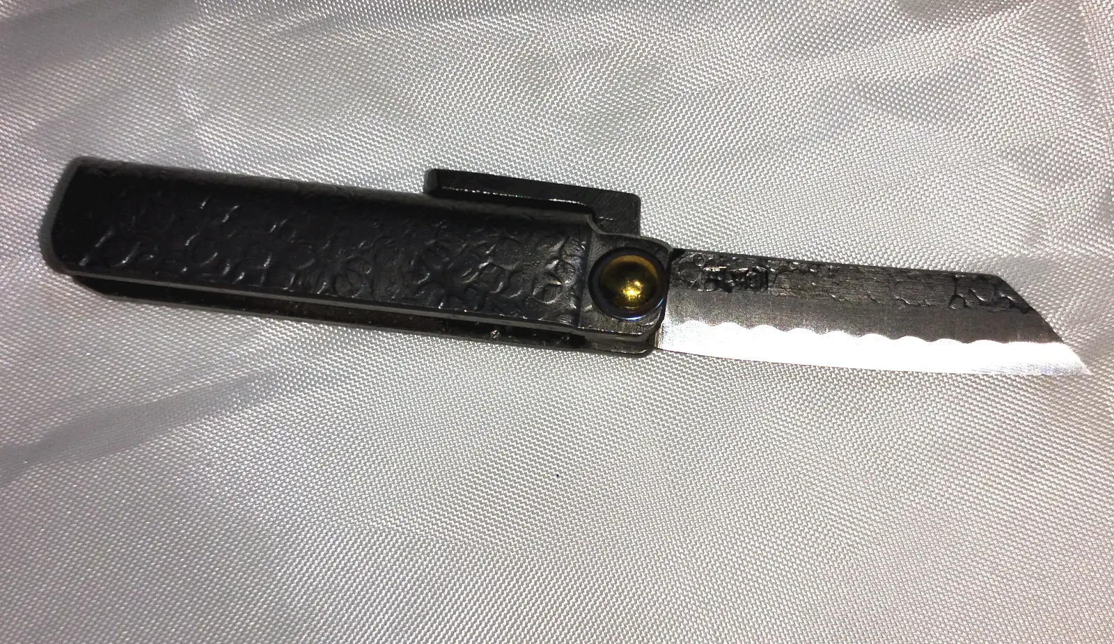 Each Tomita White Steel Higo Knife With Tsuchime Handle is hand-forged and hammered by blacksmith Tomita Miki City, using high-carbon “Shirogami” (white paper) steel for exceptional sharpness and durability. The tsuchime (hammered) iron handle offers both texture and traditional Japanese aesthetics, making these knives practical for daily tasks as well as collectible heirlooms. Each knife reflects the legacy craftsmanship of generations of Japanese folding knife artistry.